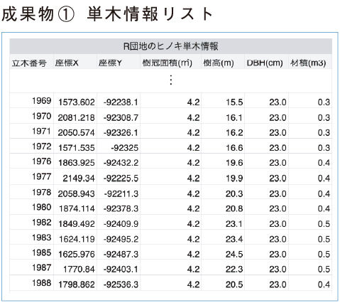 成果物:①単木情報リスト ②オルソ画像と単木情報(GIS用) ③施業前・施業後の林分情報